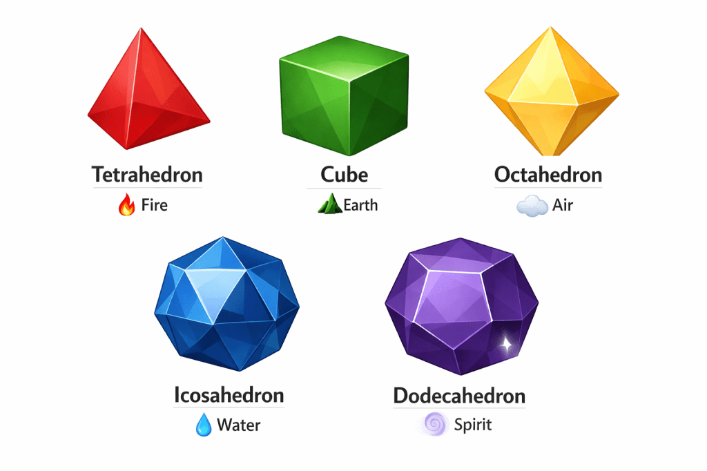 - Platonic Solids: These five geometric shapes (tetrahedron/fire, cube/Earth, octahedron/air, dodecahedron/spirit, and icosahedron/water) are believed to represent the elements of earth, air, fire, water, and spirit, serving as foundational symbols of the physical and metaphysical realms.